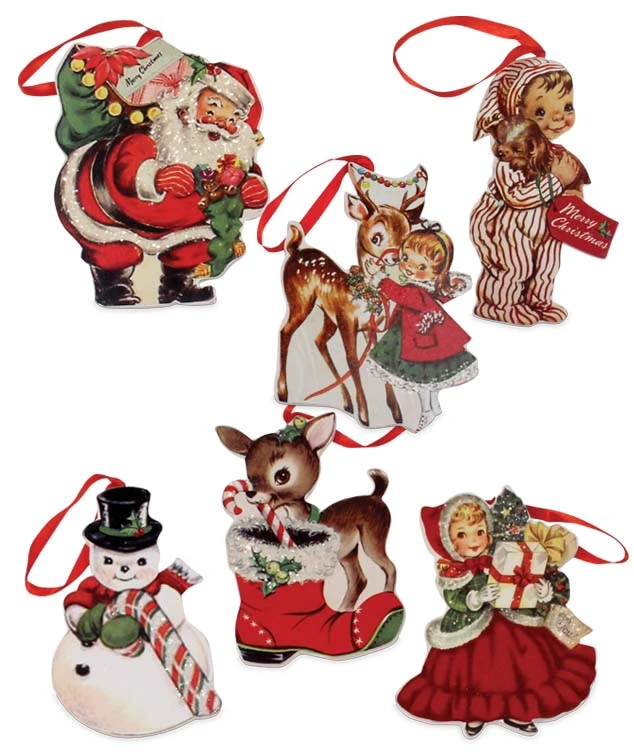 Adorne your tree with a ton of fun Retro Appeal with these Retro Christmas Dummy Board Ornaments. Get nostalgic with retro images of Santa, Christmas children, reindeer, and snowman.