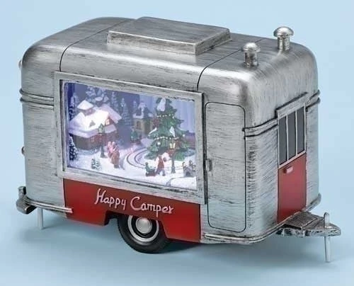 - Retro trailer shaped music box lights displaying a delightful rotating winter scene and plays eight favorite Christmas songs.